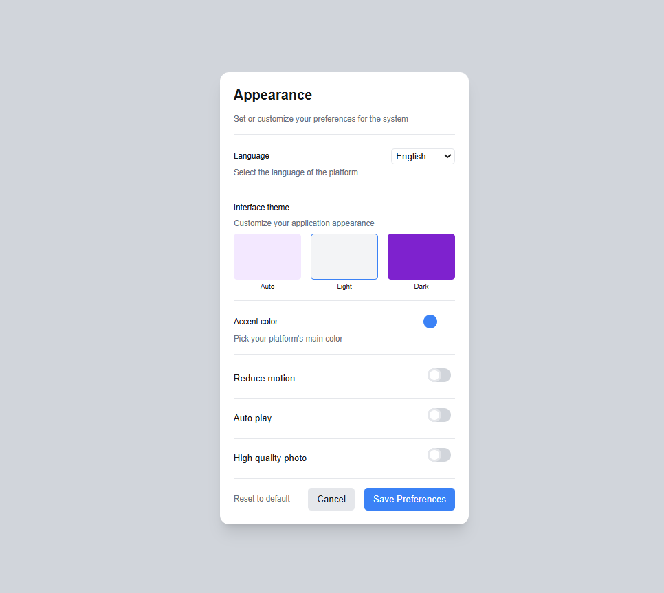 Esta card está diseñada para permitir a los usuarios personalizar la apariencia de una plataforma, incluyendo la selección del idioma, el tema de la interfaz, el color principal de acento, y opciones para reducir movimiento, reproducción automática y calidad de fotos. El objetivo fue aplicar conceptos de diseño responsivo y componentes reutilizables en un entorno de desarrollo moderno, logrando una interfaz limpia y funcional.